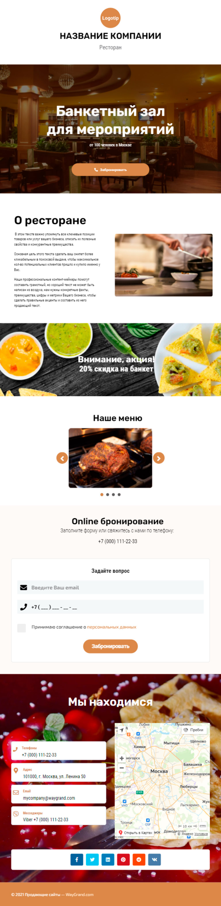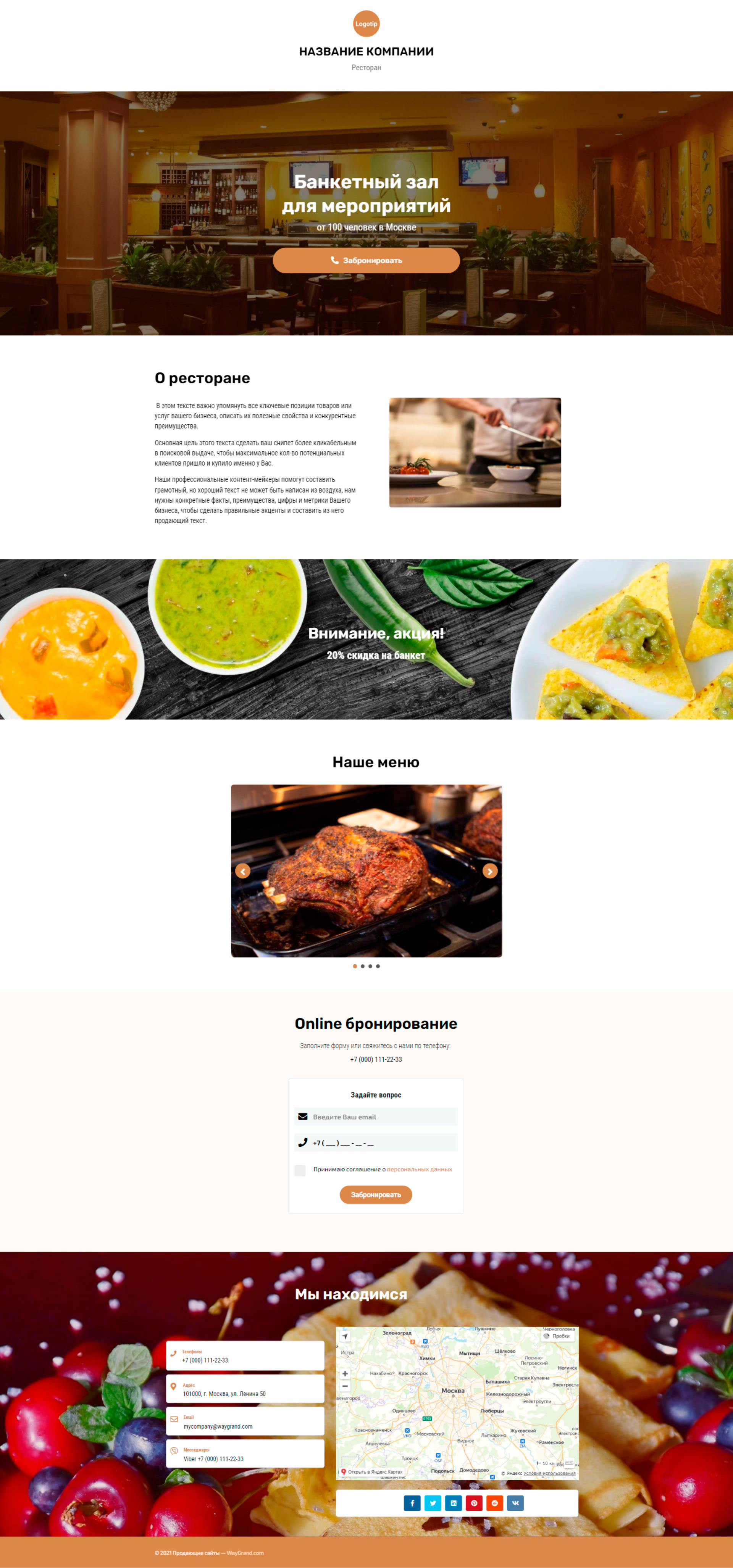- Промоблок "Банкетный зал" с кнопкой призыва к действию "Забронировать"