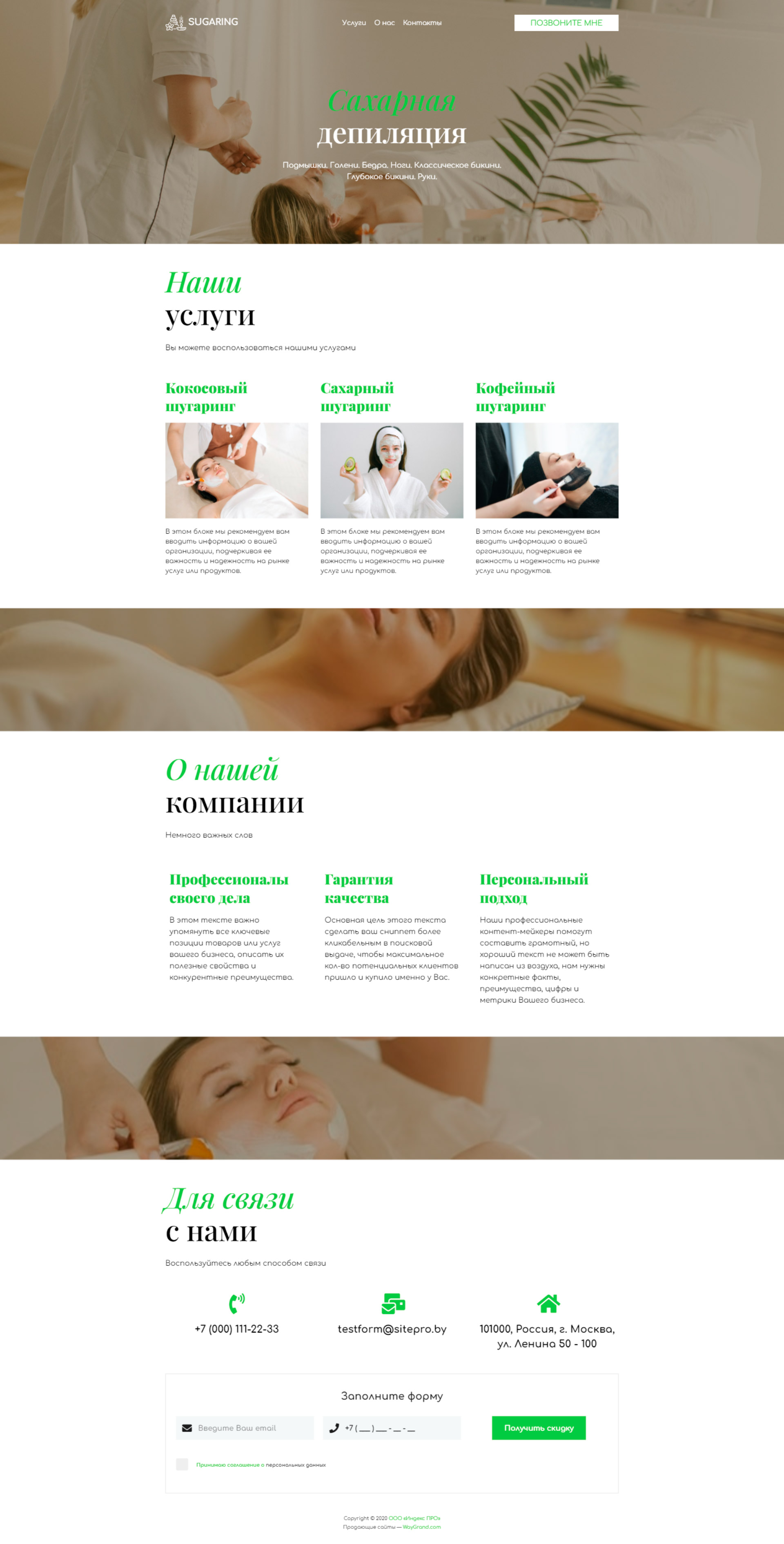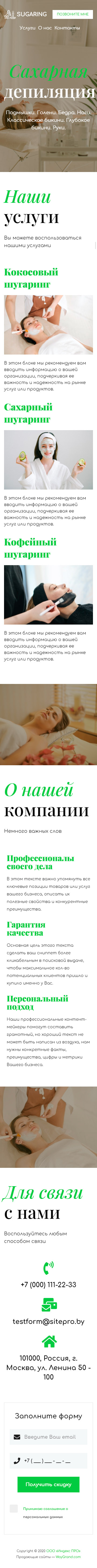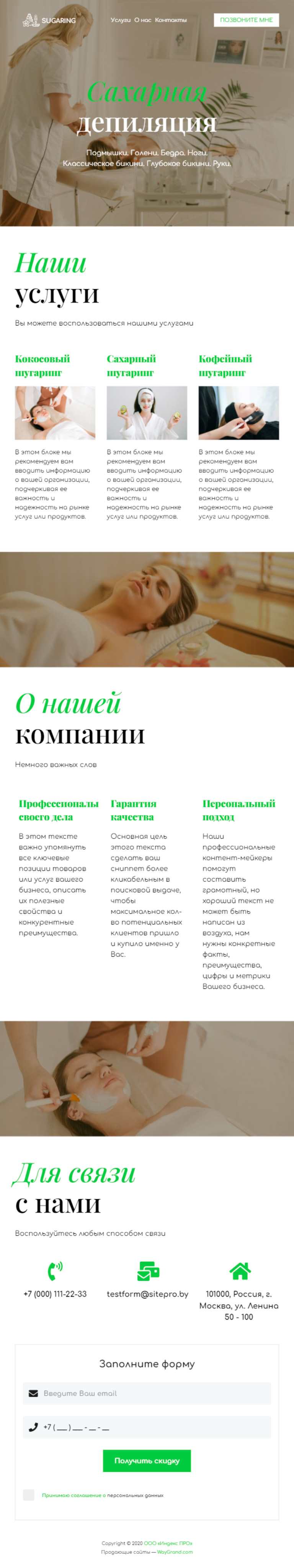 Закажите готовый продающий сайт визитка #1105101 в Соликамске за 5-7 дня «под ключ»: свёрстан, отрисован и готов к рекламе. Тематика шаблона «Сахарная депиляция/Шугаринг».