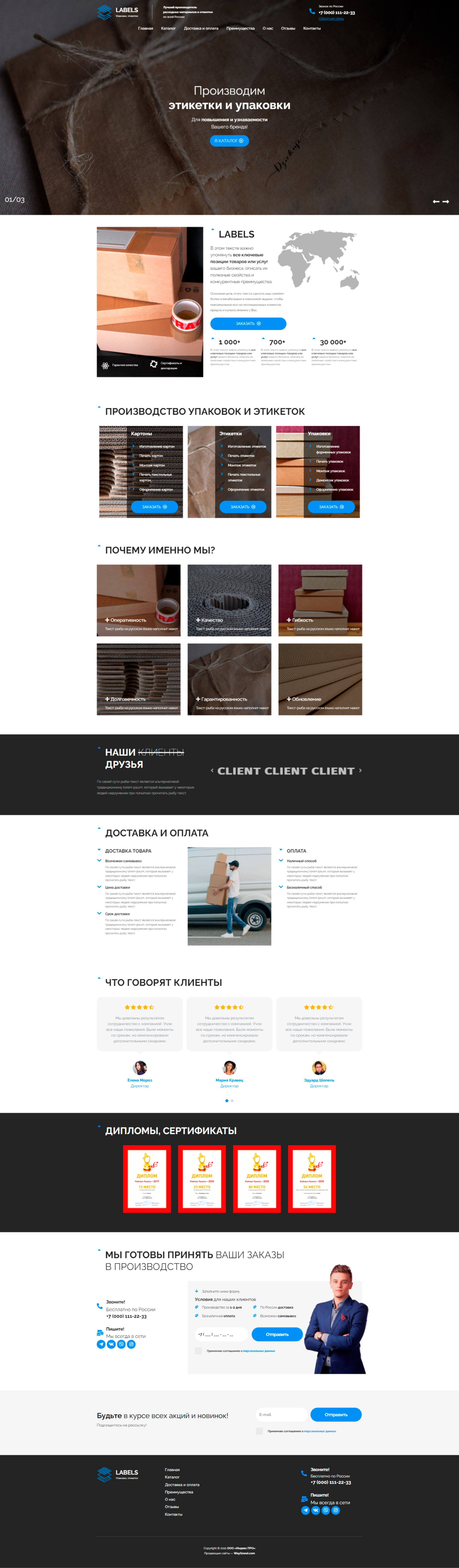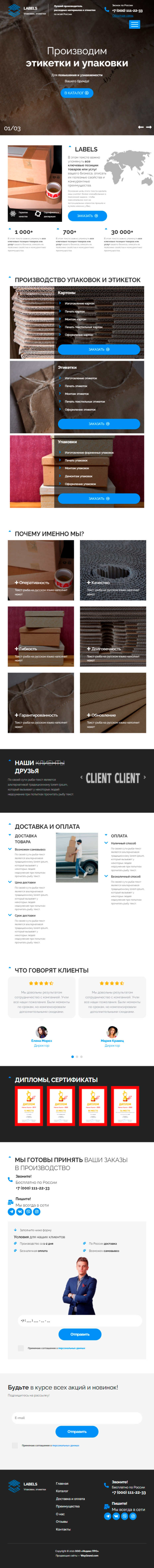 - Промогалерея "Производим этикетки и упаковки" с кнопкой призыв к действию "В каталог"