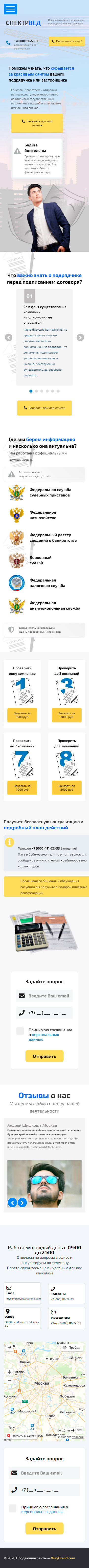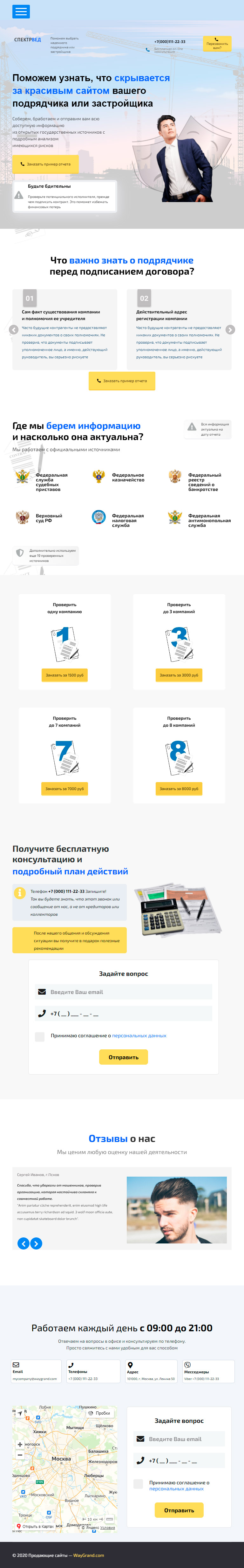 - Промоблок "Поможем узнать, что скрывается за красивым сайтом вашего подрядчика или застройщика" с кнопкой призыва к действию "Заказать пример отчёта"