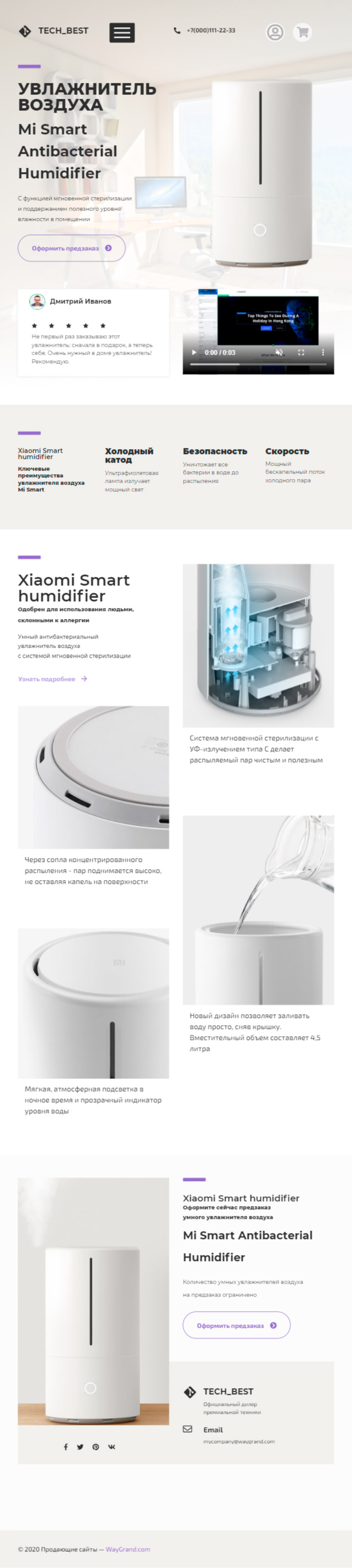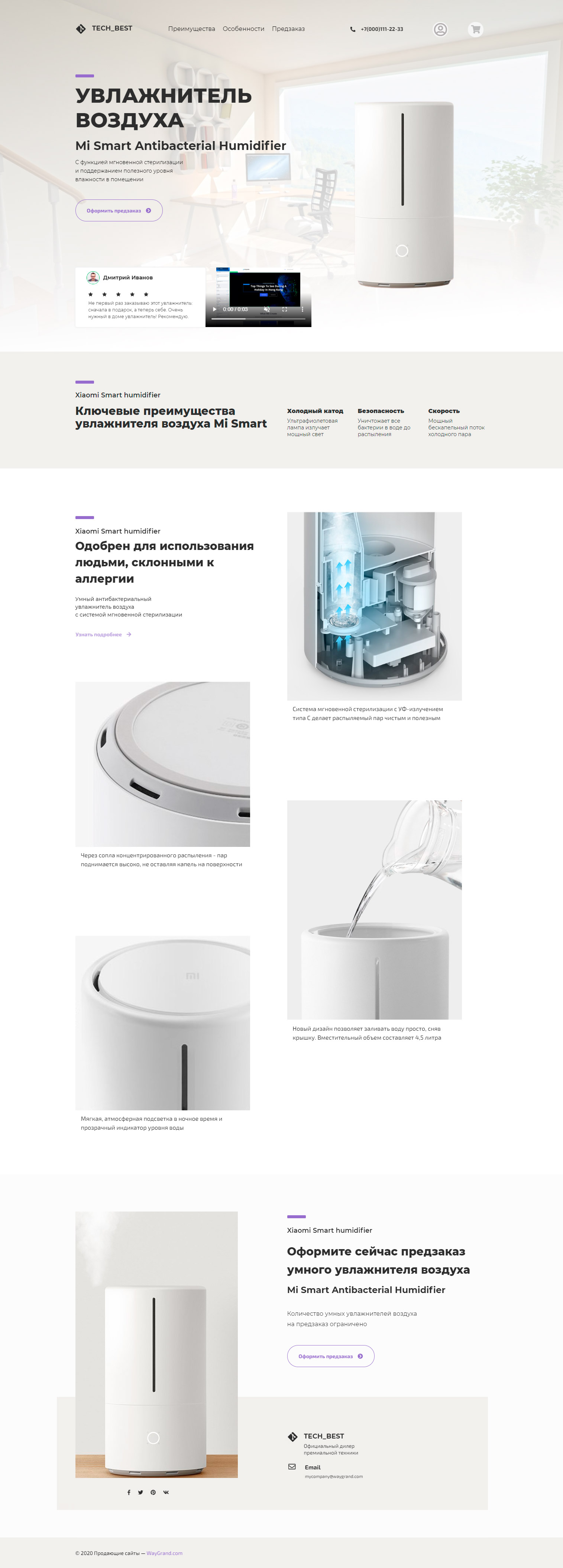 - Промоблок "Увлажнитель воздуха" с кнопкой призыва к действию "Оформить предзаказ"
