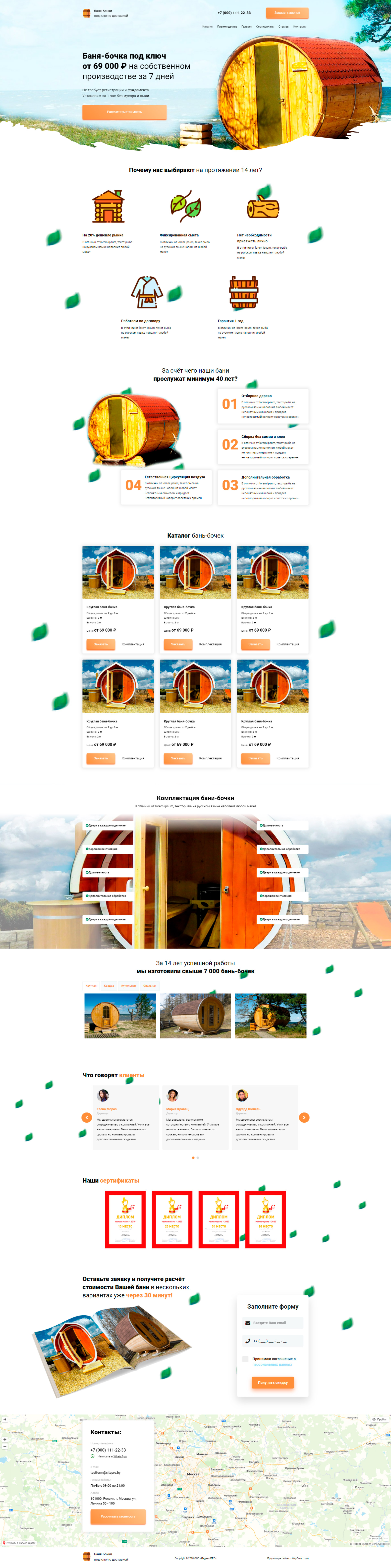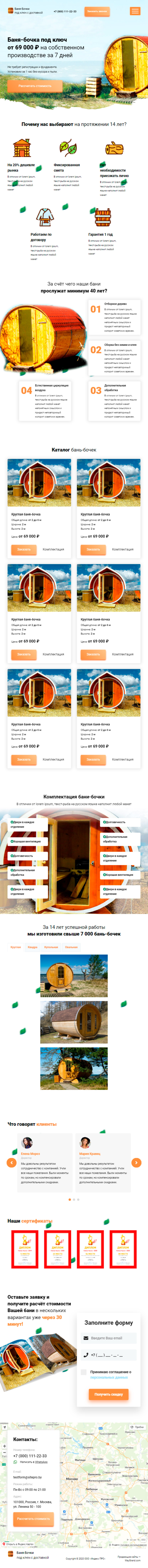 Закажите готовый продающий сайт лендинг #2172204 в Соликамске за 1-3 дня «под ключ»: свёрстан, отрисован и готов к рекламе. Тематика шаблона «Баня-бочки».